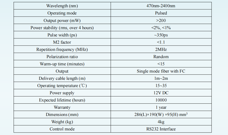 超连续谱光纤激光器,波长范围470nm-2400nm,功率>200mW,M2<1.1,具有体积小,光束质量好,线宽窄,长寿命等特点,广泛应用于光纤传感、工业检测、宽带光谱学、OCT、 荧光成像等领域